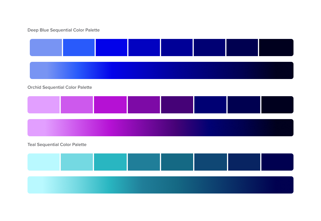 Sequential colors aid users to distinguish numeric meaning in a visualization. These are a gradation of colors that go from light to dark.