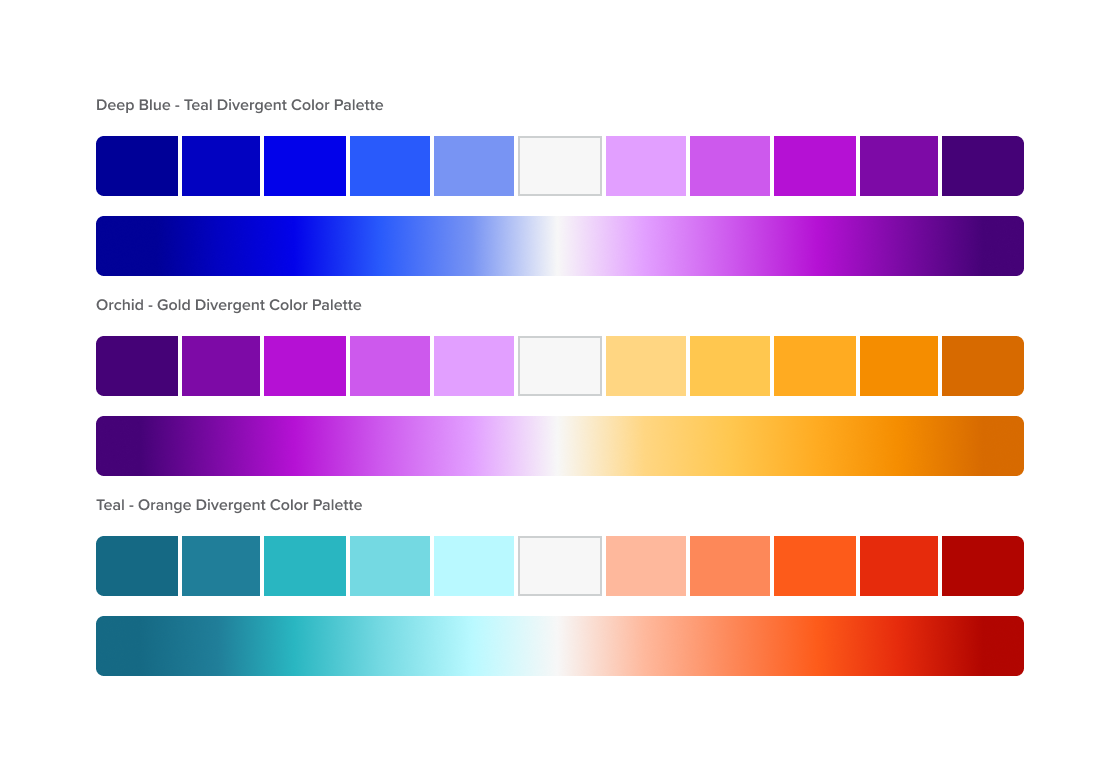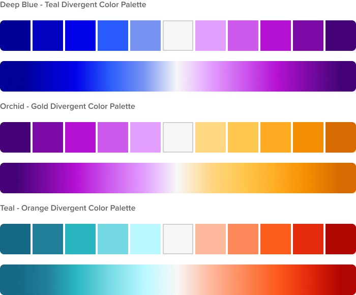 Divergent colors aid users to distinguish numeric meaning also. They’re useful when dealing with a range of two extreme with a baseline. (Ex. Negative to Positive Values)